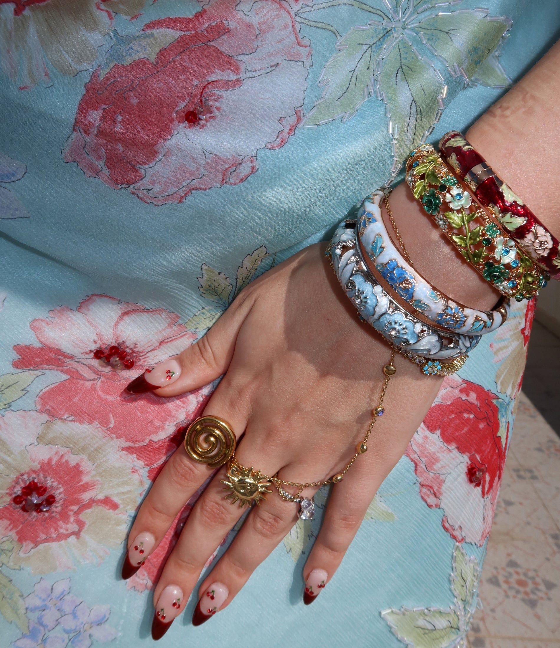 Inspired by the bold colours and intricate designs of Desi culture, this cloisonné bangle is giving South Asian vintage glam with a modern twist. The delicate floral details and glossy enamel finish make it a dreamy statement piece - whether you’re stacking up or keeping it solo.