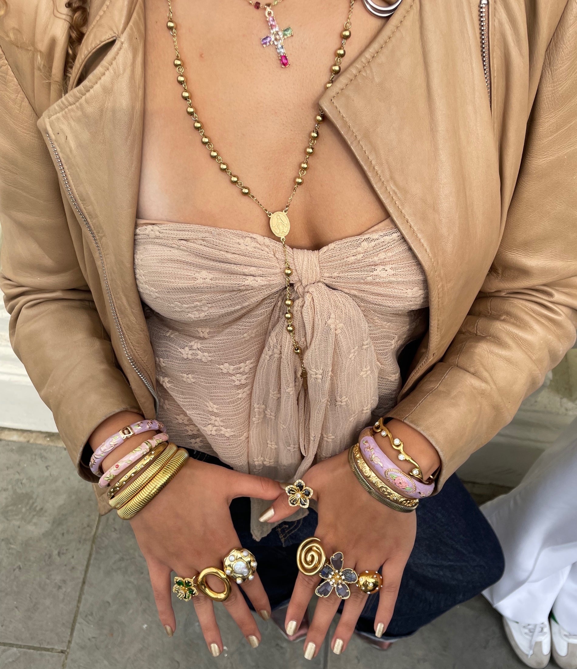 This floral cloisonné bangle is all about timeless details. The hand-painted enamel flowers and gold-toned edges create a soft yet striking look.